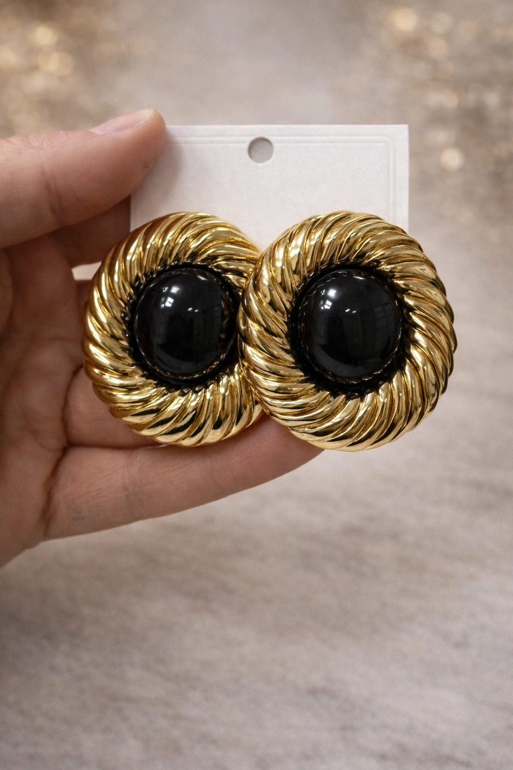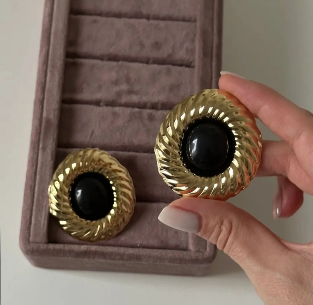 Parlak gold yüzey ile kontrast oluşturan siyah taş detayı, küpeye derinlik ve güçlü bir duruş kazandırır. Hem günlük kombinlerde hem de özel davetlerde stilinizi tamamlayan vazgeçilmez bir parça olacaktır.
