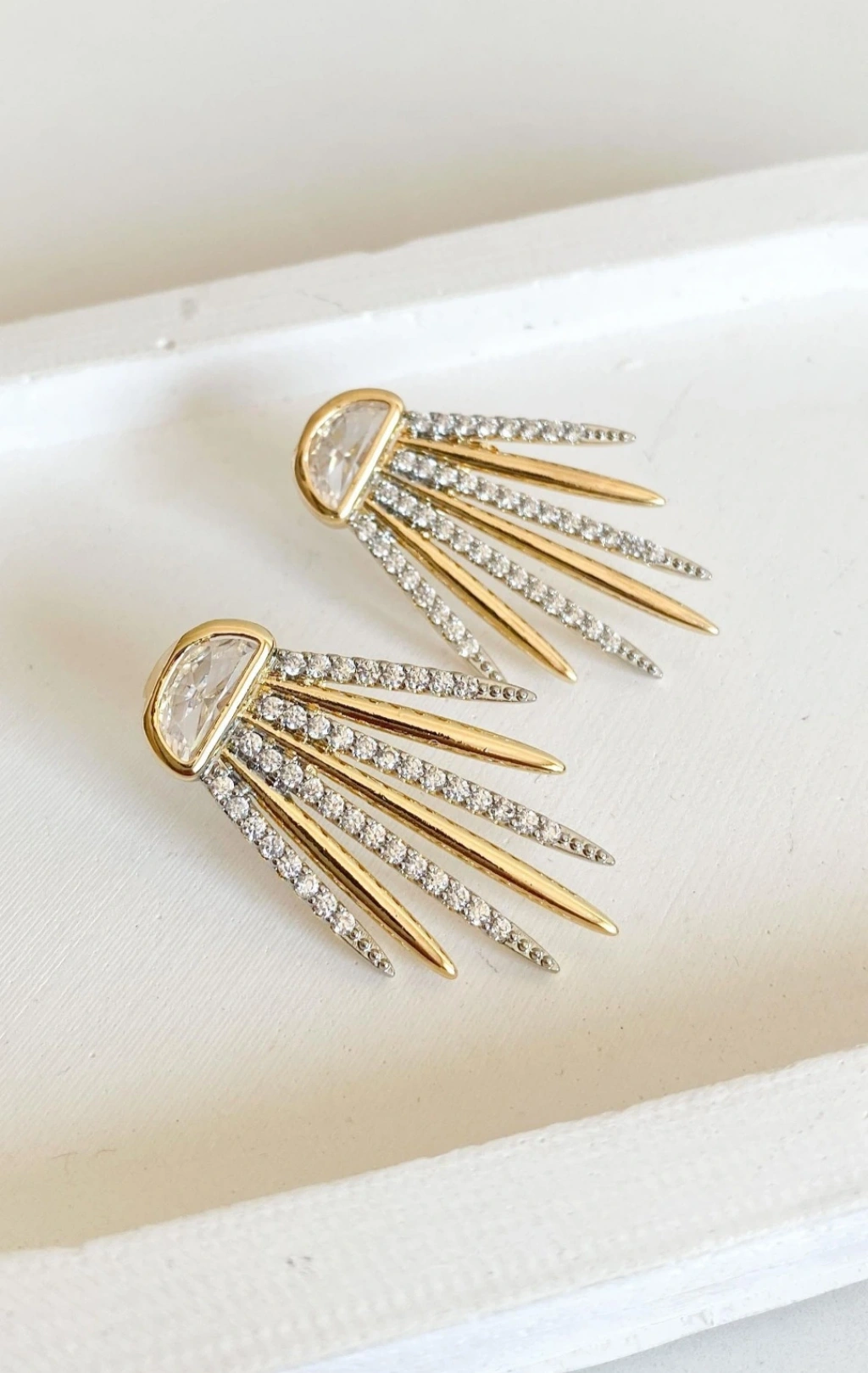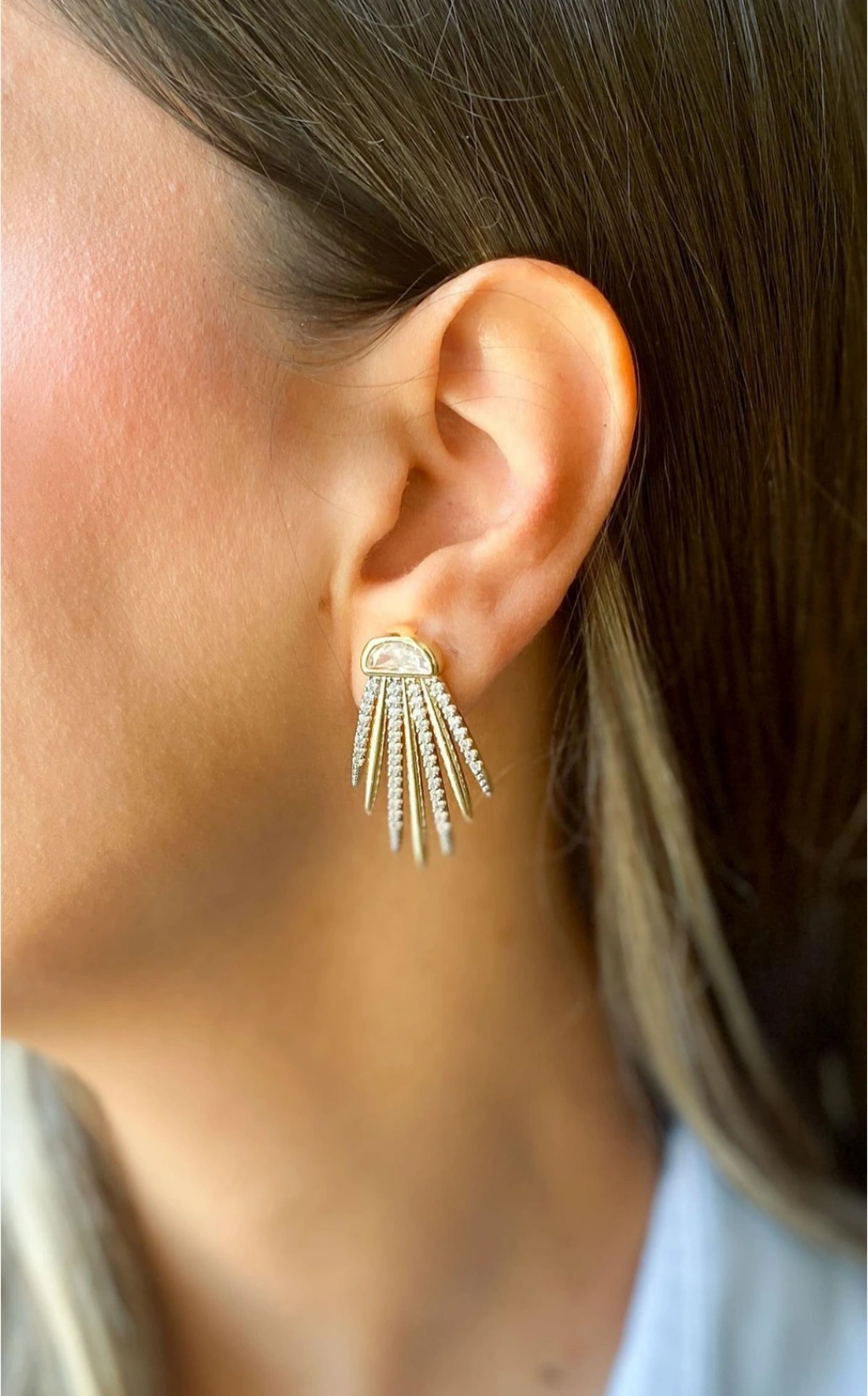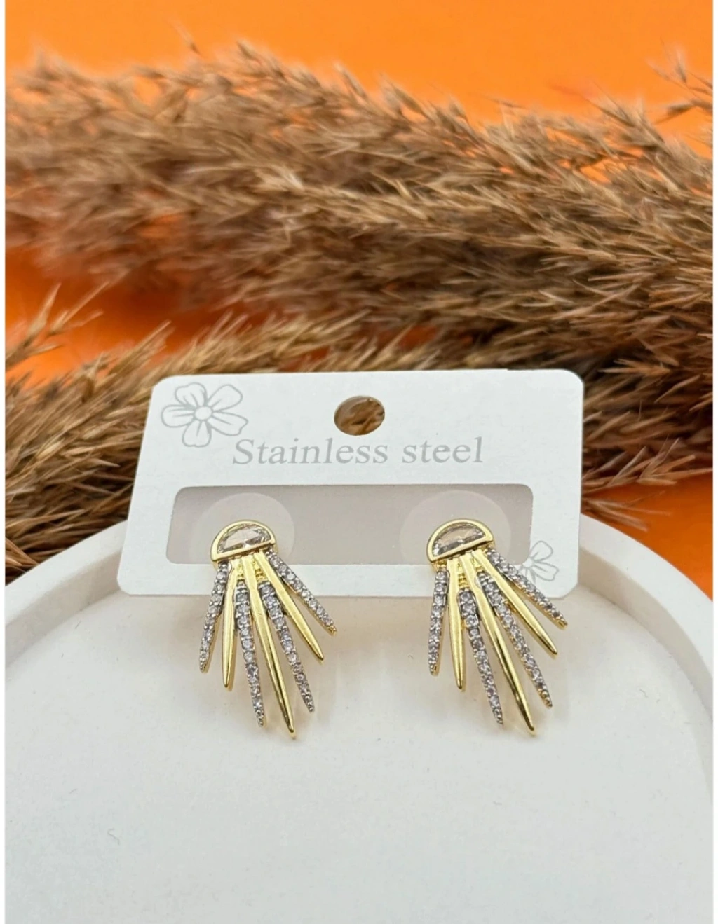 Bu tasarım, güç, zarafet ve özgüveni aynı anda yansıtır. Gold rengin sıcak parıltısı, taşların sofistike ışıltısıyla birleşerek “Luxury & VIP” bir görünüm oluşturur. Modern kadınların güçlü duruşunu vurgulayan bu küpe, hem profesyonel ortamda hem de özel günlerde etkileyici bir stil imzası bırakır.