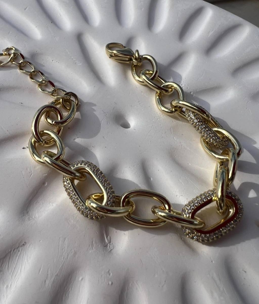 Modern ve güçlü tasarımıyla öne çıkan bu gold renkli bileklik, şıklığı ve iddiayı bir araya getiriyor. Kalın zincir formu ve taş detaylı halka geçişleri sayesinde bileğinizde dikkat çekici ve lüks bir görünüm sunar.