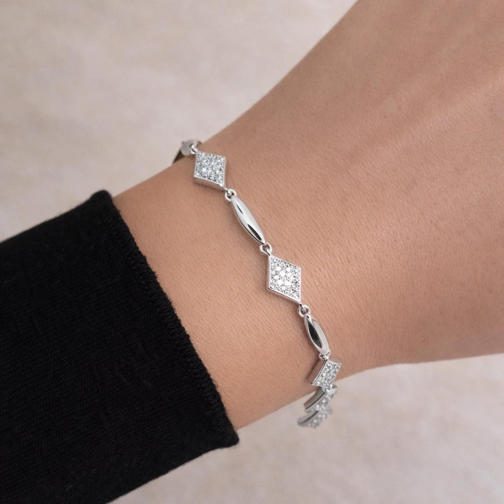Zarafeti ve modern çizgileri bir araya getiren bu özel bileklik, stiline ışıltılı ve şık bir dokunuş katmak isteyenler için ideal bir seçim! ✨