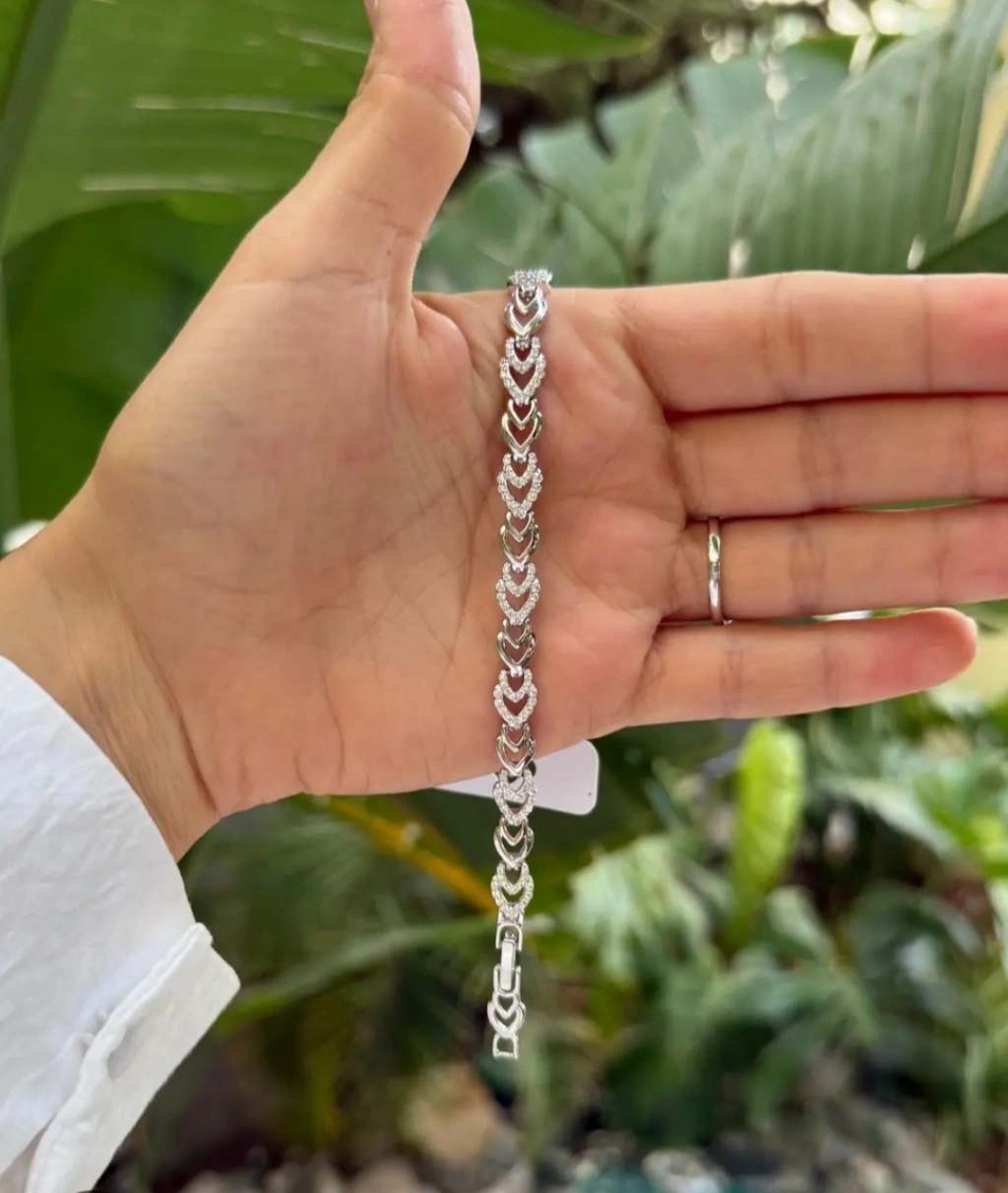 Aşkın ve zarafetin sembolü olan kalp detaylarıyla tasarlanan Xuping taşlı bileklik, şıklığı ve ışıltıyı bileğinizde buluşturuyor. Gümüş rengin sade ve asil görünümü, taşların göz alıcı parıltısıyla birleşerek hem günlük kullanıma hem de özel anlara mükemmel uyum sağlar.