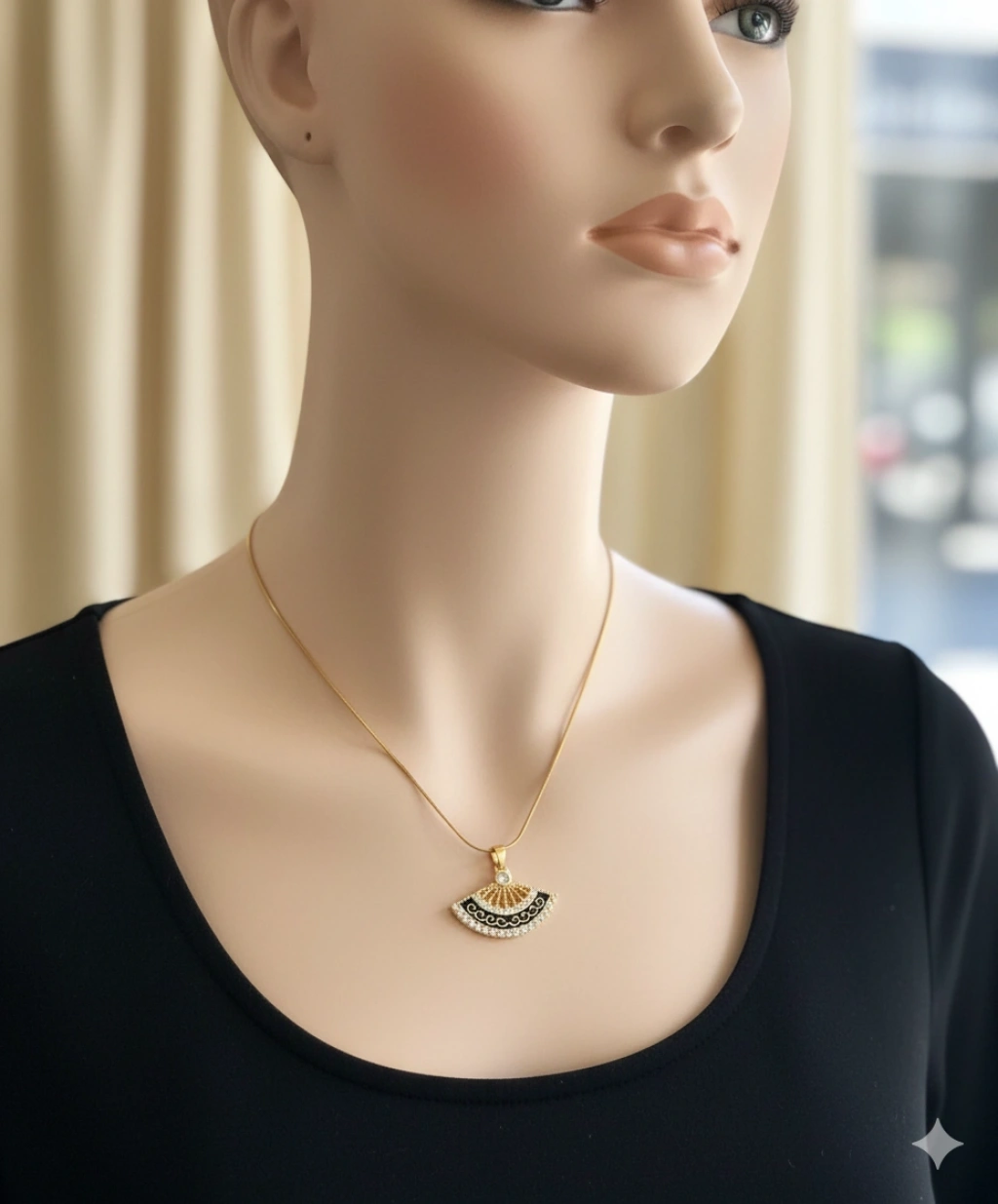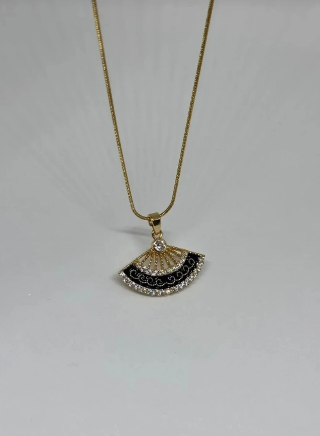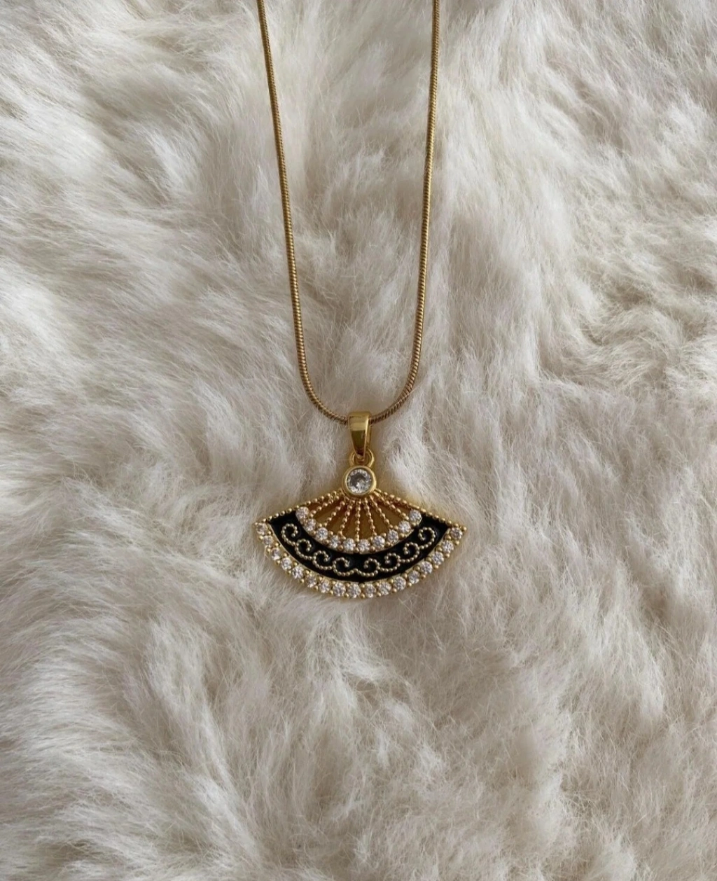 Şıklığı ve zarafeti bir araya getiren bu özel tasarım Yelpaze Kolye, gold rengin ışıltısı ile siyah detayların modern uyumunu taşlı süslemelerle buluşturuyor. Geleneksel yelpaze formundan ilham alınarak tasarlanan bu kolye, feminen çizgileriyle hem günlük kombinlerde hem de özel davetlerde stilinize sofistike bir dokunuş katar.