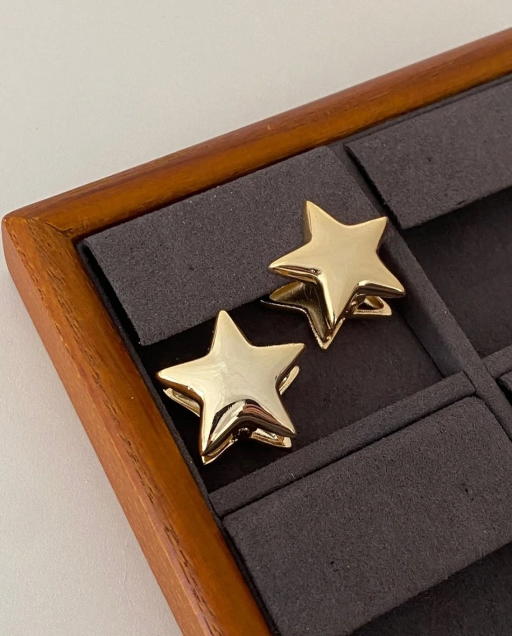 Parlak ve modern tasarımıyla dikkat çeken yıldız model gold renkli küpe, tarzınıza zarif bir ışıltı kazandırır. Işığı mükemmel şekilde yansıtan gold tonuyla hem günlük kombinlerde hem de özel davetlerde şık bir görünüm oluşturur. Hafif yapısı sayesinde gün boyu konforlu kullanım sunar. Gökyüzünün ışıltısından ilham alan bu tasarım, her stile enerjik ve sofistike bir dokunuş katar.